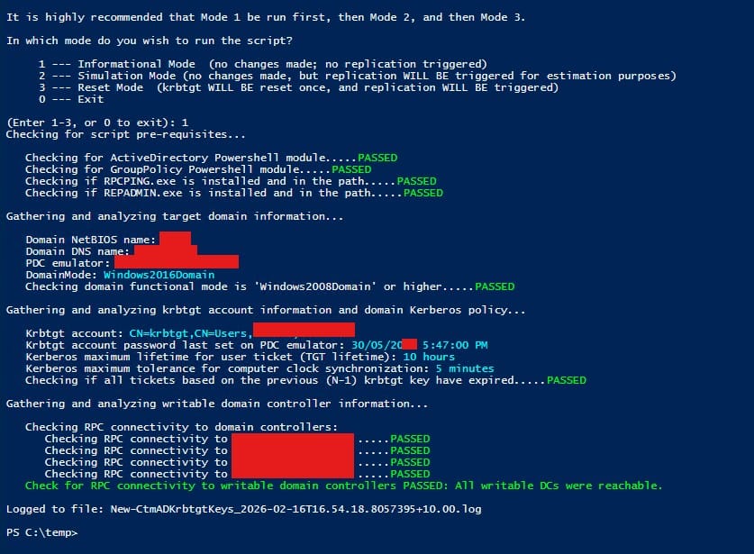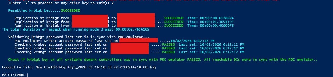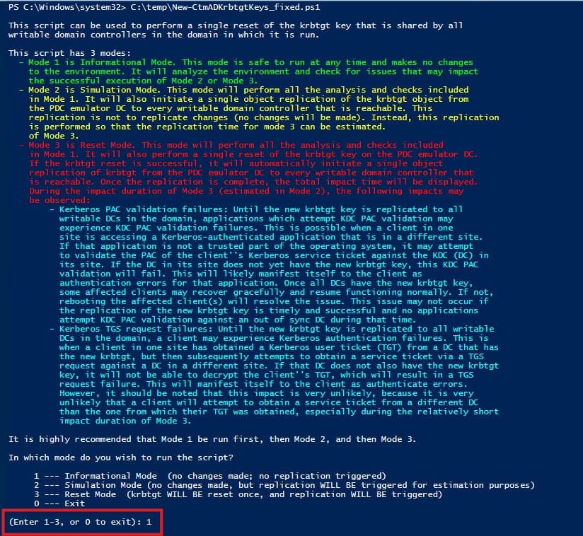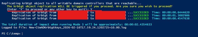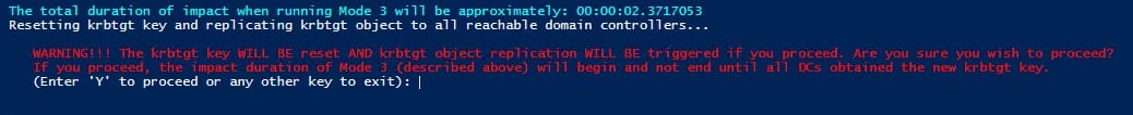 WARNING!!! The krbtgt key WILL BE reset AND krbtgt object replication WILL BE triggered if you proceed. Are you sure you wish to proceed?If you proceed, the impact duration of Mode 3 (described above) will begin and not end until all DCs obtained the new krbtgt key.'